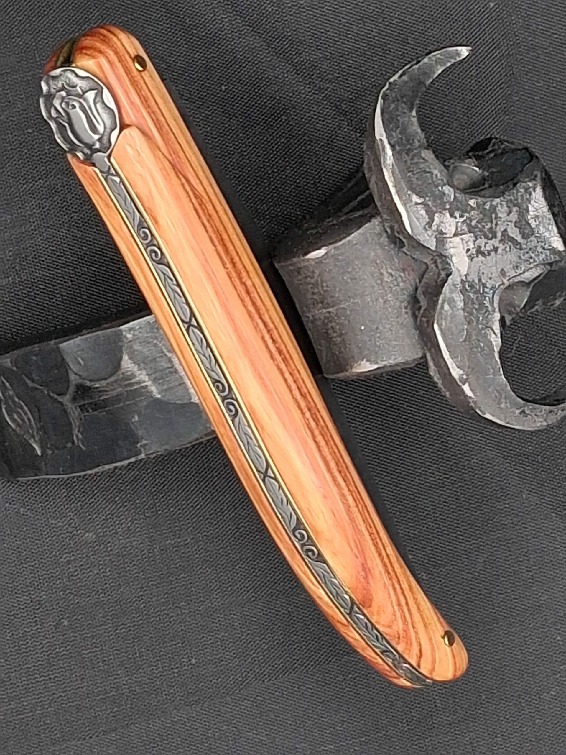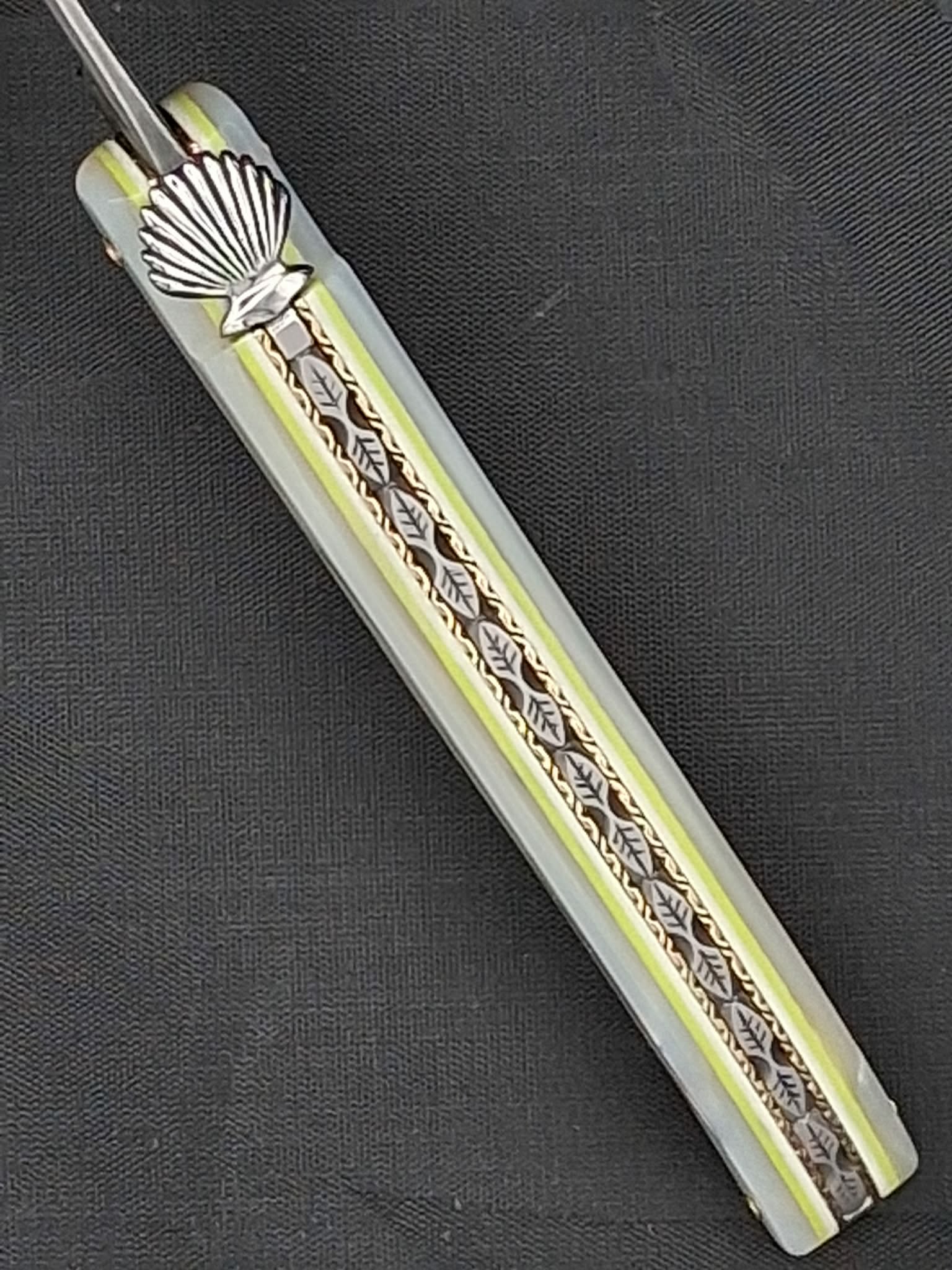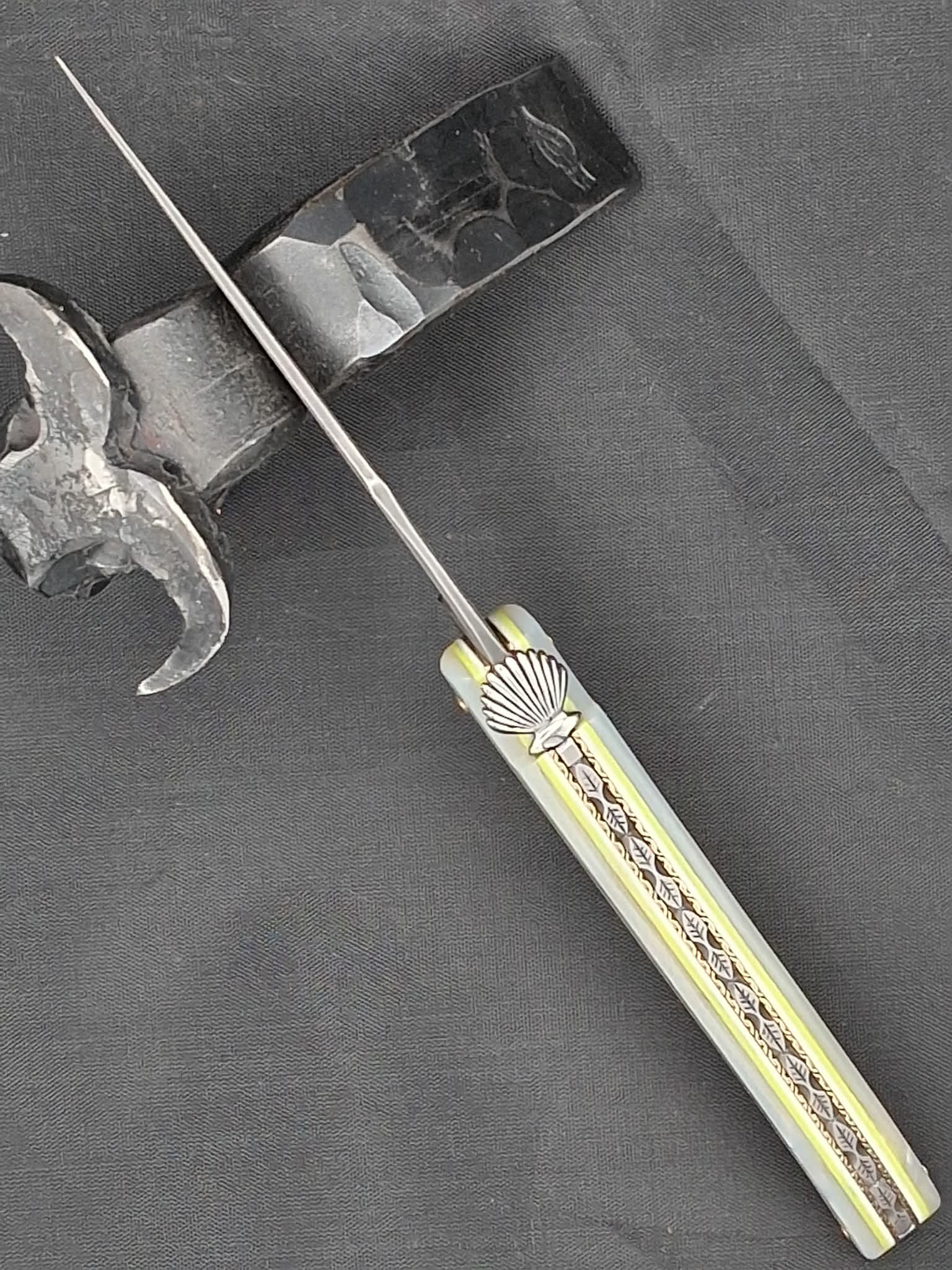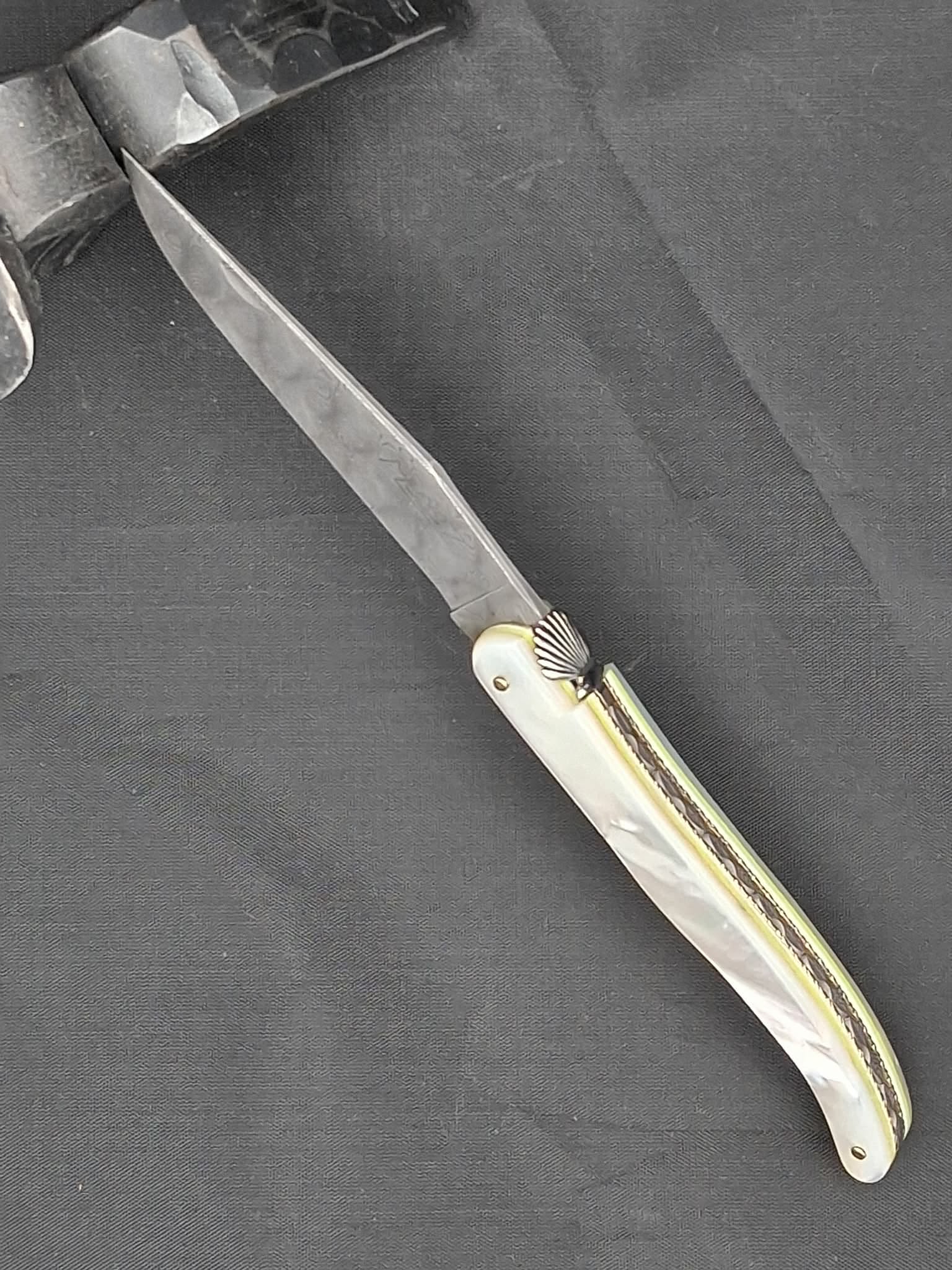 Mouche coquille Ressort guilloché Manche en nacre Platines laiton Lame en damas carbone 12cm 1300euros